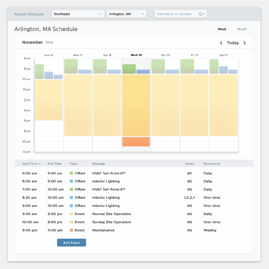 Energy Managers and Store Operators can use our simplified command and control scheduling interface to create and customize systems at each location or in regions. Pre-cooling or pre-heating stores when energy is less expensive helps avoid peak charges. That is just one of the many ways in which using thoughtful scheduling can improve operations.